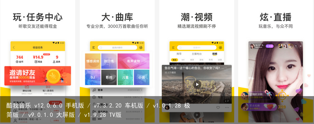 酷我音乐 v12.0.6.0 手机版 / v7.3.2.20 车机版 / v1.0.1.28 极简版 / v9.0.1.0 大屏版 / v1.9.28 TV版