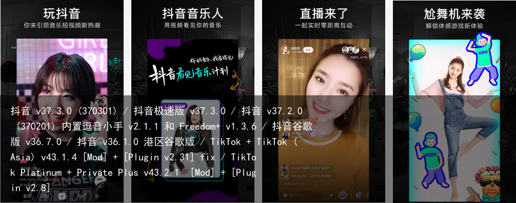 抖音 v37.3.0 (370301) / 抖音极速版 v37.3.0 / 抖音 v37.2.0 (370201) 内置逗音小手 v2.1.1 和 Freedom+ v1.3.6 / 抖音谷歌版 v36.7.0 / 抖音 v36.1.0 港区谷歌版 / TikTok + TikTok (Asia) v43.1.4 [Mod] + [Plugin v2.31] fix / TikTok Platinum + Private Plus v43.2.1 [Mod] + [Plugin v2.8]